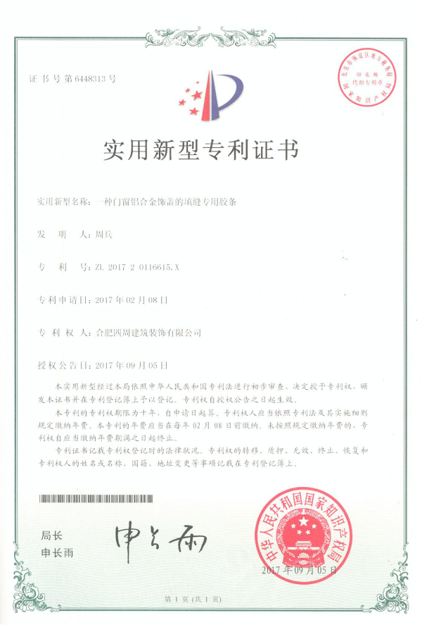 一種門窗鋁合金飾蓋的填縫專用膠條專利證書